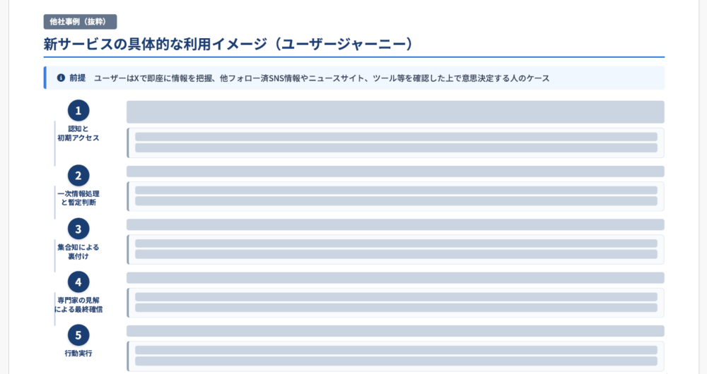 「誰が、なぜこのサービスを必要とするのか」という解像度を高めました 。 ターゲットを「正確性を重視するリサーチ担当者」と定義し、「多忙な中で膨大な情報を読み解く負荷を減らしたい」というインサイトを発掘 。単なる効率化ツールではなく、「客観的事実に基づき、最短距離で確実な意思決定ができる体験」をUXゴールとして設定しました 。